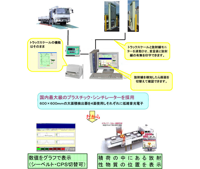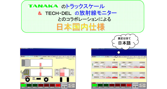 TANAKAの放射線検知器付きトラックスケールは放射性物質を発見、モニターにて警告し、計量伝票にプリントアウトします。