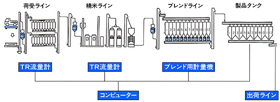 ○ 各タンクからコンベヤー上に落下する米の量をコンピューターで正確に自動制御